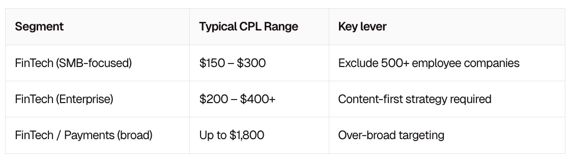LinkedIn’s 2026 benchmarks put average B2B CPL at around $276, with wide variation depending on targeting and segment.